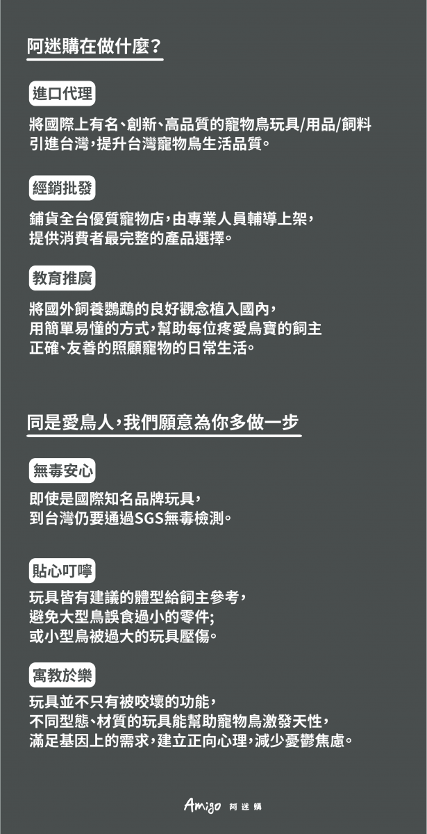 秉持著對待家人朋友的精神,阿迷購透過優質產品進口與專業研發團隊開發設計,針對鸚鵡的習性,挑選各式符合天性的玩具用品,讓飼主能提供鳥寶優質友善的生活用品,提升寵物生活品質。