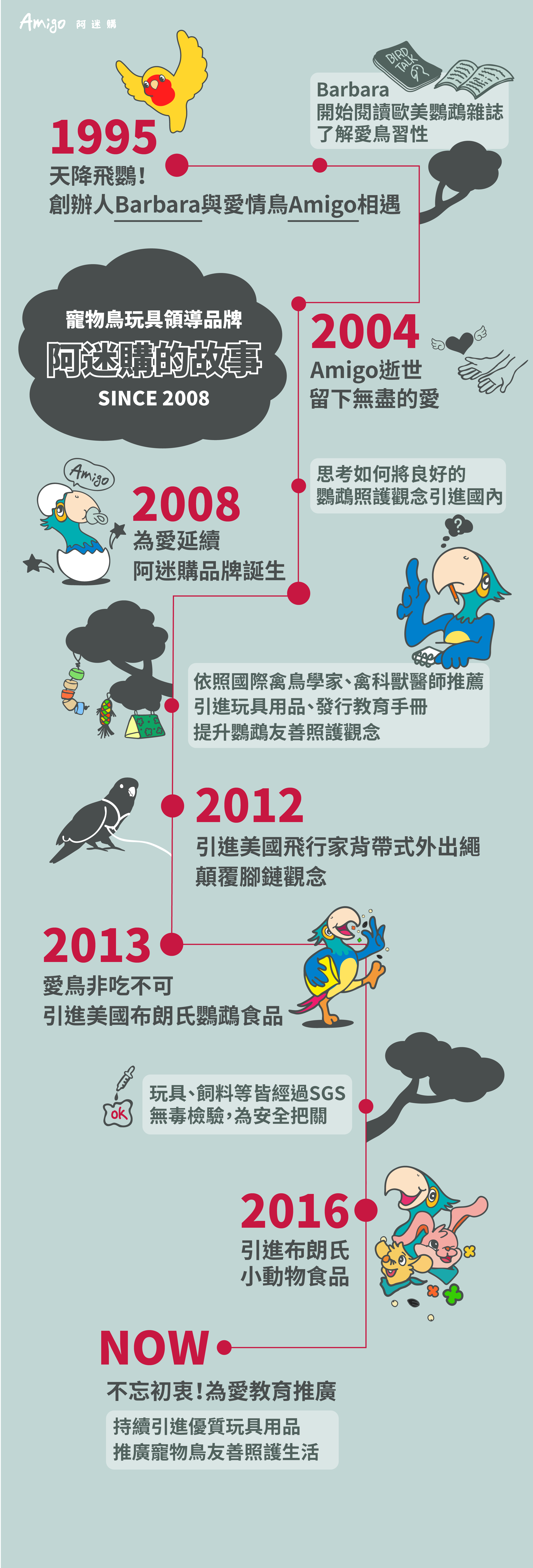 1995年 一隻迷途愛情鳥飛到阿迷購創辦人-Barbara當時公司的窗外,她看鳥兒可愛,開窗讓牠進來,取名為Amigo,也開啟了她的愛鳥機關,讓她從此之後為鸚鵡(尤其是愛情鳥)著迷不已。