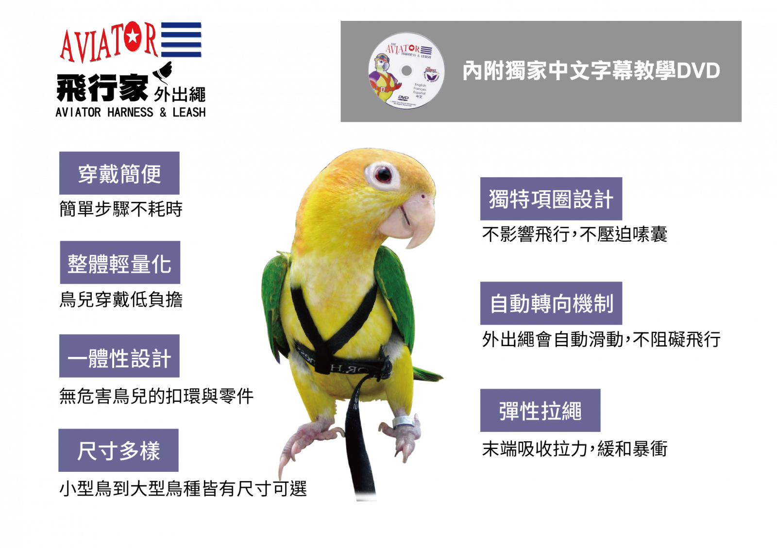 美國鸚鵡大學The Parrot University專為鸚鵡研發,讓全世界的寵物鳥能在安全、無負擔的保護下與飼主一同外出。