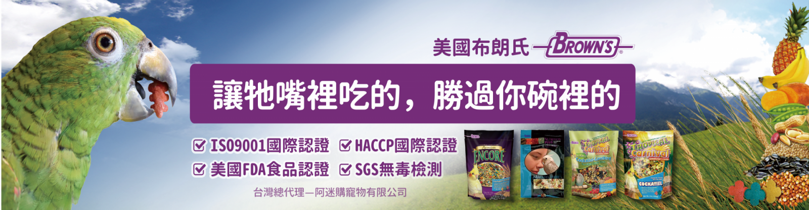 布朗氏家族深感寵物鳥為家庭中的一份子,因此堅持所有產品皆選用最優質的新鮮食材製成,再